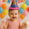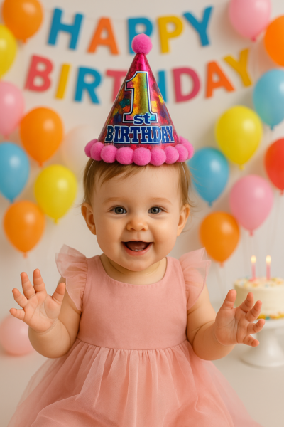Celebrate the milestone with this vibrant 1st birthday cone hat. Designed with a colorful print, soft pom-pom trim, and a fluffy topper, it’s the perfect accessory to make the little one shine on their big day.