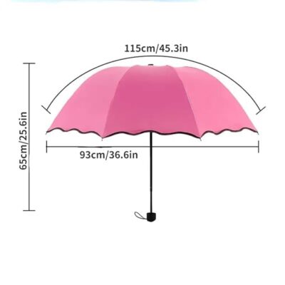 This 3-Fold Magic Umbrella combines beauty and practicality with its unique blooming flower design and curved-edge style. Made with high-density waterproof polyester fabric and a strong metal shaft, it offers reliable protection during heavy rain. The inner UV-blocking coating shields you from harmful sun rays, making it ideal for both sunny and rainy days. Its compact, foldable design with an umbrella bag ensures easy portability, while the vibrant artwork adds a touch of elegance to any outfit. Perfect for travel, outdoor shoots, park visits, and daily use—this umbrella lets your personal style shine through in every season.
