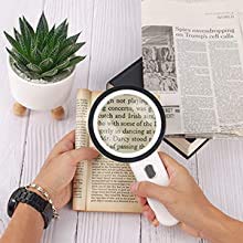 Powerful 30X handheld magnifying glass with double glass lenses and 12 bright LED lights. Easy to use, lightweight, and perfect for reading books, newspapers, and fine details—ideal for seniors and low-vision users.