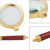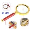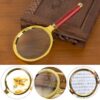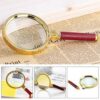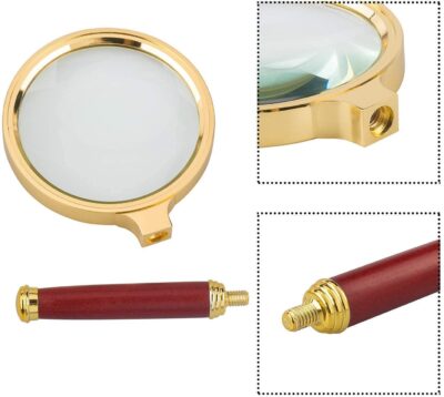 This Double Glass 3X High Power Antique Handheld Magnifier is designed for clear, detailed viewing of small text and fine objects. Featuring an 80mm optical glass lens, it offers sharp 3X magnification ideal for reading, jewelry inspection, soldering, crafting, stamps, maps, and more. The stylish gold and red metal frame adds a vintage touch, while the sturdy plastic handle ensures a comfortable grip.