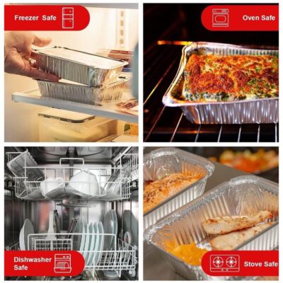 These 450 ml aluminium foil containers with lids are a versatile and convenient solution for food packing, meal prep, baking, and takeaway storage. Made from premium food-grade aluminium foil, they’re designed to be leak-resistant and hygienic, making them perfect for lunch boxes, leftovers, side dishes, curries, desserts, and packed meals. The sturdy construction allows you to freeze, refrigerate, bake, reheat, and transport food without switching containers, giving you flexibility and ease in the kitchen. These trays are both oven-safe and freezer-safe, so you can go from prep to serving without hassle, and the included fitted lids help keep food fresh and secure during travel and storage — especially handy for takeaways, travel, parties, catering, and home meal delivery. Lightweight yet durable, they offer a disposable and space-saving option that simplifies cleanup while still protecting your food’s taste and quality.
