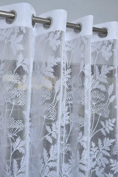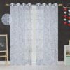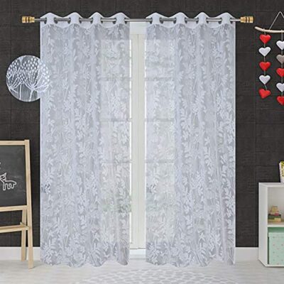 Enhance your doorway or tall window opening with this stylish set of two curtain panels, each measuring approximately 4 ft wide × 7 ft long (≈ 122 cm × 213 cm) — ideal for full-height coverage. Crafted in a heavy tissue net fabric with a delicate floral motif, these panels deliver a semi-transparent, sheer aesthetic that softly filters daylight while offering a degree of privacy. The top is finished with metal or plastic grommets (eyelets) for smooth hanging and easy movement along a standard curtain rod. The bright white tone of the net fabric gives a fresh, airy feel to your space — perfect for living rooms, bedrooms or transitional areas where a light-filled ambiance is preferred over full blackout. These curtains are machine-washable and designed for everyday use with minimal fuss, offering an elegant balance of decorative appeal and practicality.