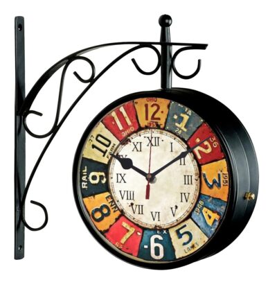 A vintage abstract theme double side iron railway clock with a 10 x 10 inch size, ideal for home or kitchen décor. Its classic design brings both functionality and charm to any wall.