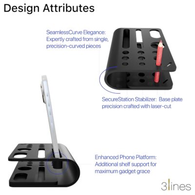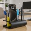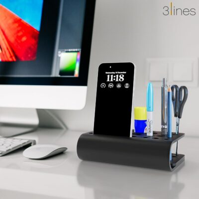 This Acrylic Tiny Twist Desk Organizer features individual compartments for pens, pencils, and small stationery along with a built-in phone stand. Its compact black design keeps your workspace neat, modern, and highly functional.