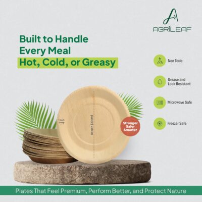 AGRILEAF 10″ Round Areca Palm Leaf Plates (48-Pack) are premium, natural disposable plates made from fallen areca palm leaves, making them eco-friendly, compostable, and plastic-free. Stronger and sturdier than paper and bagasse plates, they are designed to handle hot, cold, and oily foods without bending or leaking. These plates are microwave and freezer safe, offering added convenience for serving and reheating. Ideal for parties, events, weddings, festivals, and everyday use, AGRILEAF palm leaf plates provide a hygienic, use-and-throw dining solution while supporting a sustainable and environmentally responsible lifestyle.