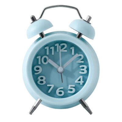 A 10 cm twin bell alarm clock in blue, ideal for students, kids, and heavy sleepers. Compact and functional, perfect for study tables or bedrooms.
