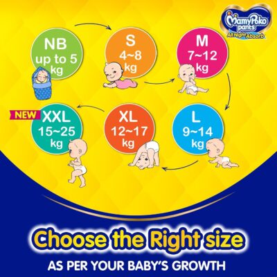 All Night Absorb Pant Style Baby Diapers in XX-Large size offer enhanced overnight protection for babies weighing 15–25 kg. With 50% wider coverage and repeated absorption, these diapers ensure 12-hour leakage-free comfort.