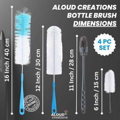 Complete 4-Piece Set – Includes tiny, small, medium, and large brushes to fit narrow-neck bottles, baby bottles, water jugs, mugs, vases, wine bottles, decanters, and more.