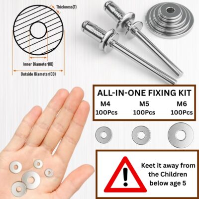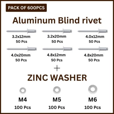 This Aluminium Blind Rivet & Flat Washer Assortment Set (600 Pieces) offers a complete fastening solution for both professionals and DIY enthusiasts. The kit includes 6 popular rivet sizes (3.2×12, 3.2×20, 4.0×12, 4.0×20, 4.8×12, 4.8×20 – 50 pcs each)** and 3 essential washer sizes (M4, M5, M6 – 100 pcs each)** to meet various project requirements.