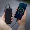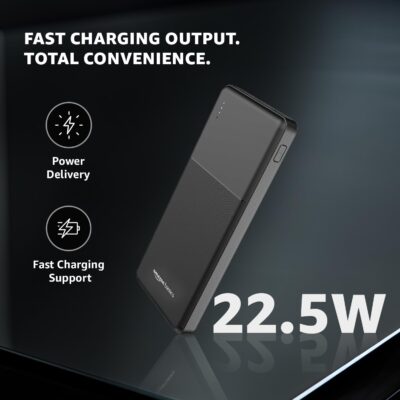 Stay charged wherever you go with the Amazon Basics 10000 mAh Fast-Charging Power Bank. Equipped with a 22.5 W high-speed output, it can charge a 5000 mAh phone up to 50 % in just 50 minutes.