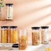 The airtight silicone-gasket lids seal in freshness while keeping moisture, dust, and pests out, making these jars ideal for storing a wide range of dry foods such as sugar, salt, rice, pasta, cereals, snacks, pulses, and dry fruits. The clear, see-through body allows easy identification of contents without opening the lids, while the stackable, modular design helps maximize shelf and fridge space.
