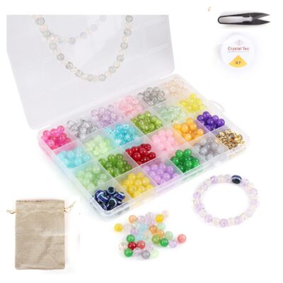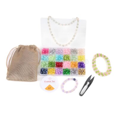 This kit includes over 350 colorful glass beads, 10 meters of elastic thread, a jute storage bag, and a cutter, providing everything needed to create unique bracelets and accessories. Perfect for birthday gifts or creative play.