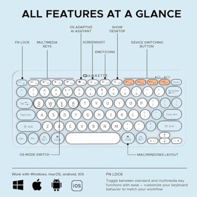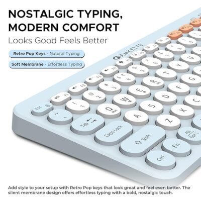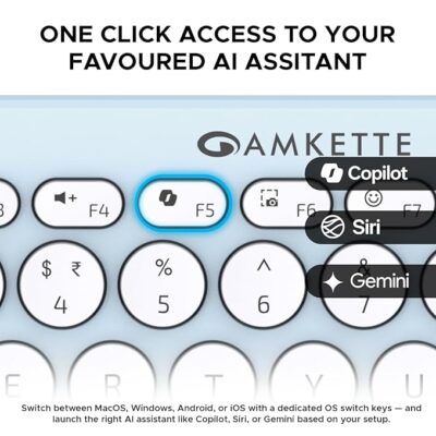 Amkette Optimus Bluetooth 4‑in‑1 Wireless Keyboard – New and Improved Optimus BT 4-in-1 Multi-Device Wireless Keyboard (Blue) is a versatile and modern wireless keyboard built for multitasking across multiple devices and platforms. It lets you connect up to 4 devices simultaneously — 3 via Bluetooth and 1 via a 2.4 GHz USB wireless dongle — and switch between them quickly with dedicated keys for improved productivity. Designed with silent membrane (“Retro Pop”) keys, it delivers a smooth, quiet typing experience that’s comfortable for long typing sessions. The keyboard also features OS-adaptive AI access keys that can launch tools like Microsoft Copilot on Windows, Siri on Apple devices, or Gemini on Android, as well as multimedia and shortcut keys for quick control of volume, screenshots, emojis, show desktop, and more. Its dual-OS layout ensures compatibility across Windows, macOS, Android, and iOS, making it ideal for users who work with phones, tablets, and laptops interchangeably. Powered by 2 AAA batteries with smart power-saving features (including on/off switch and sleep mode), the keyboard offers portable and long-lasting performance without frequent recharging. This model is a great choice for users seeking a compact, multi-device keyboard that supports seamless switching and enhanced productivity across devices.