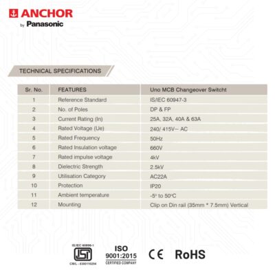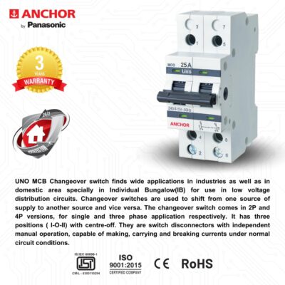 Anchor by Panasonic UNO Series 25A Dual Pole C Curve MCB provides efficient circuit protection and reliable power control. Designed as a 2 pole change over switch type MCB, it ensures safe and stable electrical performance.