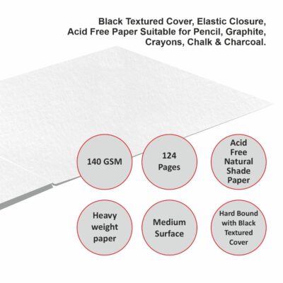 This Anupam A3 hardbound sketchbook features 140GSM acid-free natural shade paper with a landscape orientation. With 128 pages and an elastic closure, it offers durability and convenience for artists and students.