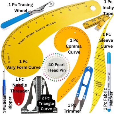Complete 12-Piece Kit – Includes French curves, armhole & sleeve curve rulers, hip curve, designer triangle, tracing wheel, fabric marker pen, thread cutter, seam ripper, inch tape, needle threader & 40 pearl head pins.