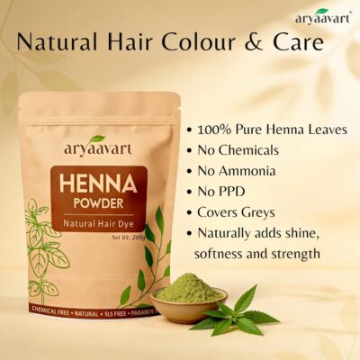 Aryaavart Herbal Henna Powder is crafted from carefully selected organic green henna leaves for pure and natural hair coloring. It helps impart a natural tint while nourishing the hair and scalp. The herbal formulation conditions hair strands, leaving them soft and manageable. Regular use supports stronger roots and improved hair texture. Free from artificial colors, preservatives, and harsh chemicals, it is gentle on sensitive scalps. This 200g pack offers safe, effective, and chemical-free hair care for all hair types.
