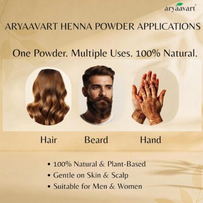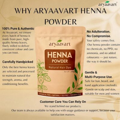 Aryaavart Herbal Henna Powder is made from organic green henna to provide natural hair coloring and care. It nourishes, conditions, and strengthens hair without harsh chemicals, suitable for all hair types.