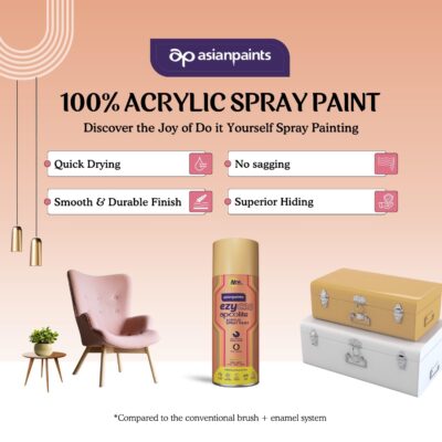 Asian Paints ezyCR8 Apcolite DIY Spray Paint in Gold is a high-quality acrylic spray designed to give a bright, elegant finish on metal, wood, wall surfaces, and various DIY projects. Its 100% acrylic formulation ensures strong adhesion and long-lasting color that stays vibrant over time. The fine spray mechanism allows smooth and even application, reducing drips and enabling a professional-looking outcome with minimal effort. This 400ml can provides ample coverage for medium to large projects, making it suitable for décor upgrades and creative craft work. The paint dries quickly, allowing users to work efficiently without long waiting intervals between coats. Its gold tone adds a premium decorative touch, perfect for revamping home décor items or restoring old objects with a fresh look. It performs well under proper indoor and outdoor conditions, maintaining finish quality and durability. The formulation is crafted to resist fading and surface wear, enhancing the longevity of the coated item. It is ideal for hobbyists, DIY enthusiasts, and anyone looking to achieve a stylish metallic sheen. Overall, this spray paint combines ease of use, reliable performance, and attractive color for versatile applications.