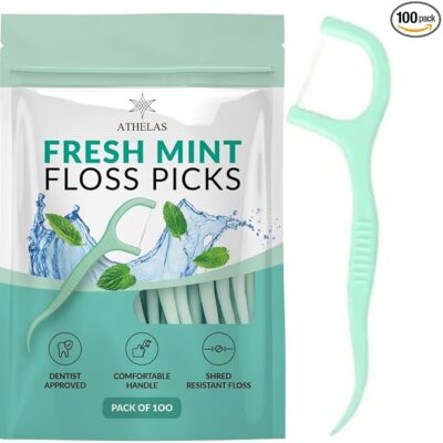 Athelas Pack of 100 Fresh Mint Dental Floss Picks are dentist-designed for effective, convenient, and hygienic daily oral care. Each floss pick features a strong, shred-resistant floss that easily slides between teeth to remove hidden food particles and plaque from hard-to-reach areas, helping to prevent cavities and gum problems. The fresh mint flavor leaves your mouth feeling clean and refreshed after every use, ensuring long-lasting fresh breath. With an easy-grip handle for better control and comfort, these disposable flossers are perfect for use at home, at work, or while traveling, making them an ideal choice for maintaining complete oral hygiene anytime, anywhere.