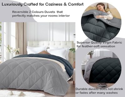 Wrap your bed in comfort and style with this high-quality comforter designed for double and king-size beds. The outer shell is crafted from ultra-soft microfiber fabric, offering a smooth, cozy feel against the skin. Inside, a generous 220 GSM fill weight ensures a warm, yet breathable layer—ideal for winter nights or use in air-conditioned rooms. Its standout feature is the reversible design: one side finished in a sophisticated grey tone and the other in rich charcoal, giving you two stylish looks in one piece—and the flexibility to match your bedding décor or simply switch things up. The comforter is built to last with quality stitching and evenly distributed fill to avoid clumping. It’s described as lightweight but warm, with enhanced breathability to help regulate comfort throughout the night. Ideal for double or king size beds, this comforter offers excellent coverage and versatility. Whether you’re topping your bed for a cozy winter’s night or upgrading your bedding set, this comforter blends practicality and aesthetics with ease.