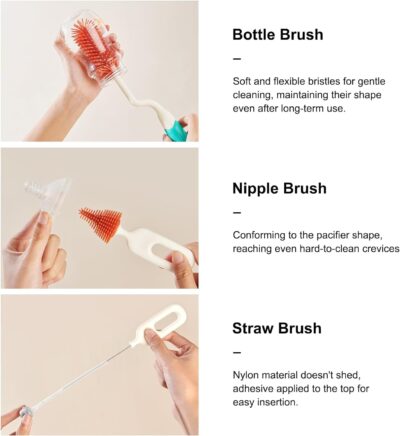 The set also includes a lid cleaning brush for effortless cleaning of bottle caps and hard-to-reach areas. Made from soft, durable, and BPA-free silicone, these brushes are gentle on surfaces while highly effective at cleaning. Designed for convenience and everyday use, this set makes maintaining clean and safe bottles simple and hassle-free for parents.