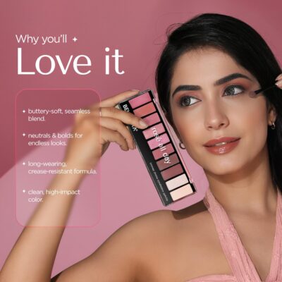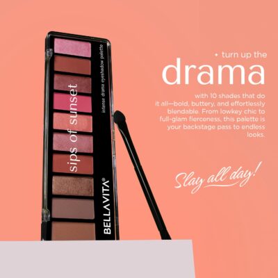 BELLAVITA Intense Drama Eyeshadow Palette Sips of Sunset features 10 blendable shades in matte, shimmer, and satin finishes.