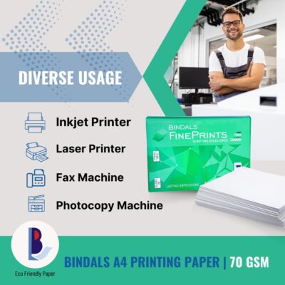 Bindal White Copier Paper A4, 70 GSM, offers bright, smooth sheets ideal for everyday printing and copying. Each ream contains 500 sheets, providing fine-quality, eco-friendly paper for home, office, and school use.