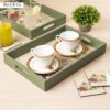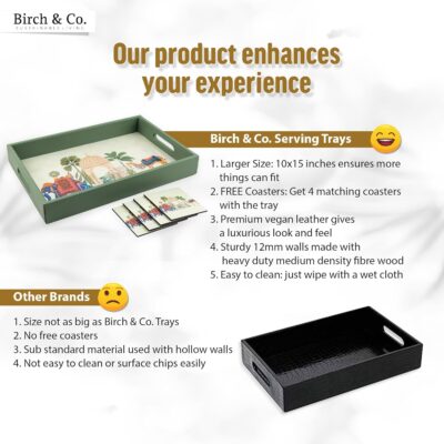 Serve in style with the Birch & Co. Premium Wooden Tray Set, crafted from durable MDF and featuring a 10 × 15 inch rectangular design. Includes 4 free coasters, easy-to-carry handles, and smooth finish—perfect for tea, coffee, snacks, and décor.