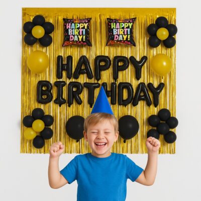 Crafted from high-quality, durable materials, the balloons and foil banner maintain their shine and shape throughout the event. The golden and black theme adds elegance, making it suitable for kids, teens, and adults alike. Ideal for home parties, office celebrations, or hall decorations, this pack ensures a festive look without hassle.