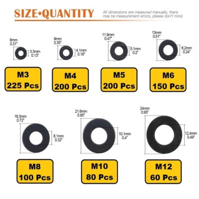 Black Flat Fender Washer Assortment Kit – 1015 Pcs (M3–M12)