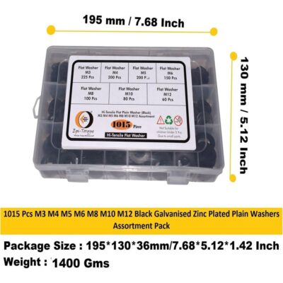 This Black Plain Flat Fender Washer Assortment Kit includes 1015 pieces in 7 common sizes—M3, M4, M5, M6, M8, M10, and M12—ideal for a wide range of fastening tasks. Made from premium mild steel with an auto black finish, these washers ensure durability, corrosion resistance, and a secure fit. Designed to distribute load evenly and prevent over-tightening or damage to materials, they’re perfect for industrial, automotive, and home applications. Each size is neatly packed in zip-lock bags and stored in a sturdy compartmentalized case for convenient organization and portability.