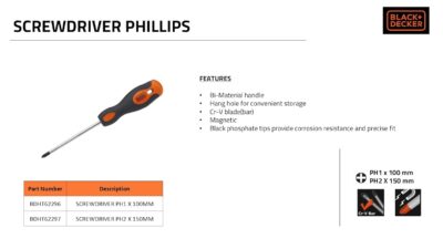 This BLACK+DECKER BDHT62296 is a Philips Screwdriver (PH1 × 100 mm) crafted for everyday household use. Its chrome-vanadium (Cr-V) steel shaft ensures durability, while the bi-material soft-grip handle offers exceptional comfort and control. Designed with a three-sided ergonomic handle, it maximizes torque and minimizes slipping or rolling during use. The magnetic black-phosphate tip enhances rust resistance and ensures a precise, reliable fit with Phillips screws. Compact and lightweight at approximately 70 g, with dimensions around 4.8 cm × 4 cm × 26.5 cm, this screwdriver is easy to handle, store, and carry around.