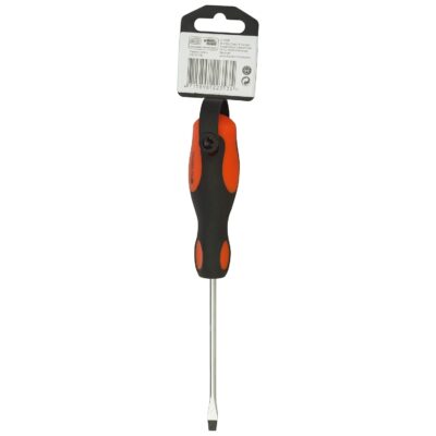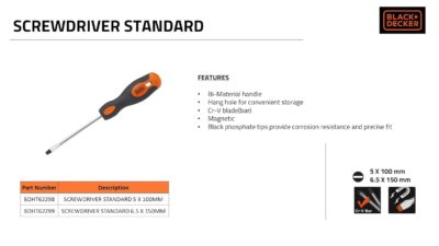 The BLACK+DECKER BDHT 62298 is a dependable slotted (flat head) screwdriver crafted for both household chores and professional tasks. Engineered with a blade made from durable chrome-vanadium (Cr-V) steel, it ensures strength and longevity. Its ergonomic handle features a bi-material soft grip, complete with a three-sided (tri-lobe) design that boosts torque, resists slipping, and prevents rolling—making it easy to handle tough fastening jobs. The magnetic black phosphate-coated tip not only resists corrosion but also provides a precise fit and enhances control when working with screws. The screwdriver’s compact size (5 mm tip diameter; 100 mm shaft length) and lightweight design (approximately 80 g) make it effortless to manoeuvre and ideal for everyday use in tight spaces