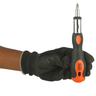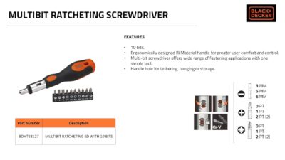 This BLACK+DECKER BDHT68127 set is a versatile, ratcheting screwdriver designed for both DIYers and professionals. Its built-in ratchet mechanism enables efficient, continuous screwdriving—rotating smoothly in one direction while resetting in the other—saving effort and time. The screwdriver features a triangular, three-sided ergonomic handle with a bi-material, anti-slip grip that resists household and garage chemicals, delivers better torque, and stays stable on surfaces. Constructed with chrome-vanadium (Cr-V) steel bits, this toolset promises enhanced durability. It includes 10 commonly used bits: SL3, SL5, SL6, Ph0, Ph1, two Ph2s, PZ1, PZ2, and PZ3—making it highly adaptable for a range of fastening needs. Compact yet sturdy, the screwdriver measures approximately 240 mm in length with dimensions around 110 × 40 × 240 mm and weighs roughly 220 g, offering balanced handling and portability.