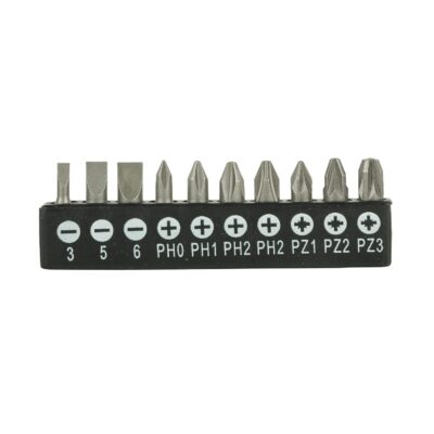 . Constructed with chrome-vanadium (Cr-V) steel bits, this toolset promises enhanced durability. It includes 10 commonly used bits: SL3, SL5, SL6, Ph0, Ph1, two Ph2s, PZ1, PZ2, and PZ3—making it highly adaptable for a range of fastening needs.