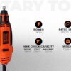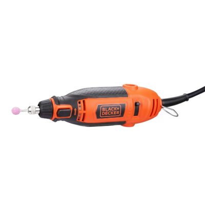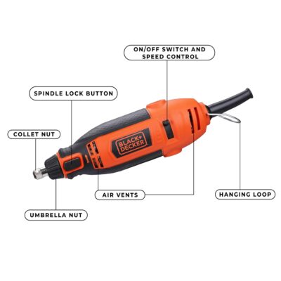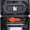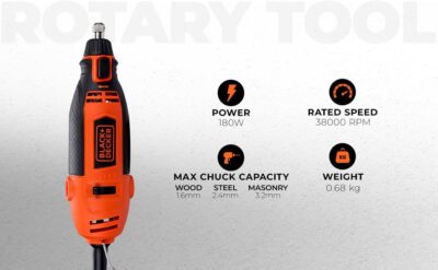 The BLACK+DECKER RT18KA-IN is a robust 180-watt corded rotary tool—clad in the brand’s signature orange and black—that brings versatile precision to DIY and professional projects. It boasts variable-speed control across five gears, delivering up to 35,000 RPM, empowering you to tailor the speed for tasks like carving, engraving, cutting, sanding, grinding, sharpening, drilling, polishing, and cleaning. The tool is housed in a spacious, sturdy kit box with a removable accessory tray for organized storage. Built for precision and adaptability, it features a spindle lock mechanism for quick accessory changes, a flexible shaft to reach tight spaces, a hanging loop for workspace convenience, plus variable speed control and ergonomic design. The comprehensive kit includes around 114 accessories—such as cutting and sanding discs, polishing wheels, brushes, collets, mandrels, and more—making it a complete solution for a wide array of materials and finishes. Technical specs round out the picture: 680 g weight, dimensions of ~35.5 × 9.4 × 29.2 cm, compatibility with 1/8″, 3/32″, and 1/6″ collets, and a chuck capacity of 1.6 / 2.4 / 3.2 mm.