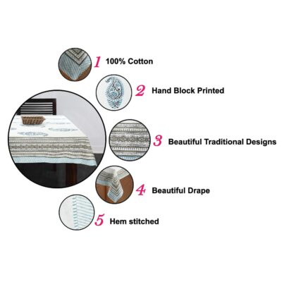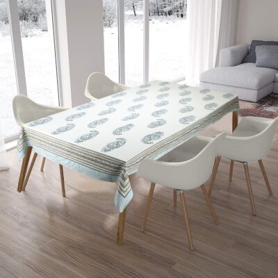 Add traditional elegance and artisanal charm to your dining area with the BLOCKS OF INDIA Cotton Hand Block/Batik Printed Table Cloth, crafted for 6-seater dining tables. Measuring 145 × 225 cm, this rectangular table cover features a stunning Turquoise Grey Paisley design, created using authentic hand block and batik printing techniques by skilled Indian artisans. Made from premium 100% cotton, it offers a soft, breathable texture that drapes beautifully while protecting your table from dust, spills, and everyday wear. The rich colors and intricate patterns bring a touch of heritage and sophistication to any home décor—perfect for everyday dining, festive gatherings, or special occasions. Durable, washable, and eco-friendly, this handcrafted tablecloth is a blend of tradition, style, and practicality, making it an elegant addition to any modern or classic dining setup.