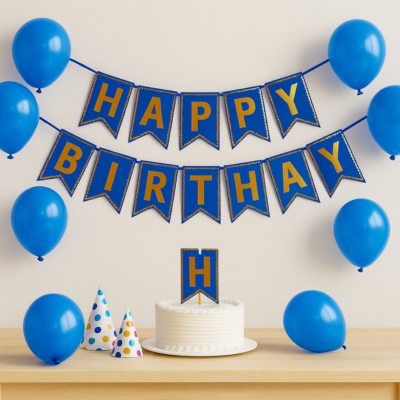 Celebrate birthdays in style with the Blue & Gold Happy Birthday Banner, a premium decoration designed to bring charm and festivity to your party setup. The banner features striking golden letters on a deep blue polka-dotted background, framed with scalloped golden edges for an elegant finish.