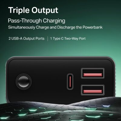 Its 22.5 W 2-way fast charging supports Quick Charge 3.0, Power Delivery (PD) and PPS protocols, delivering efficient power for all your devices. With a Type-C input/output port and two USB-A outputs, you can charge up to three devices simultaneously.