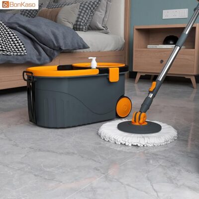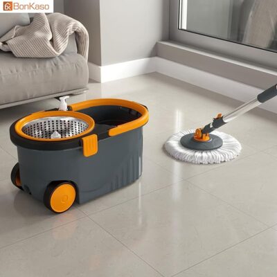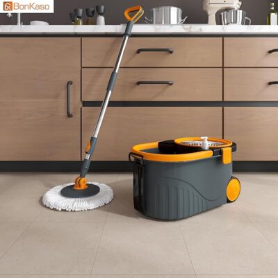 The Bonkaso Spin Mop with Stainless Steel Wringer & Big Wheels is a powerful and user-friendly floor-cleaning system designed to make mopping faster, easier, and more hygienic. It features a 360° rotating mop head that effortlessly reaches corners, edges, and under furniture for thorough cleaning. The stainless-steel wringer ensures efficient water removal, giving you better control over moisture and helping floors dry faster. Equipped with big, smooth-rolling wheels, the sturdy bucket moves easily across rooms without lifting, reducing strain and effort. The adjustable handle allows comfortable use for users of different heights, while the set includes 2 high-absorbency microfiber refill heads that effectively trap dust, dirt, and spills without scratching surfaces. Ideal for tiles, marble, granite, and other smooth floors, this spin mop set in grey & orange combines durability, convenience, and effective cleaning — perfect for homes, offices, and everyday floor care.