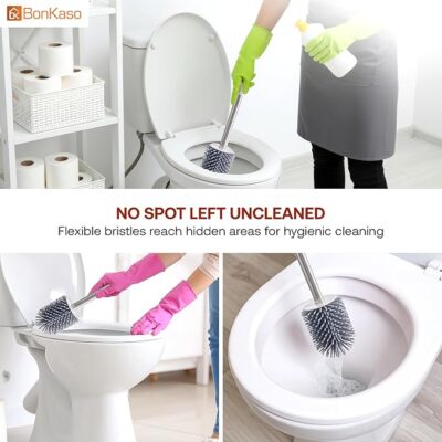 The ergonomic, anti-slip handle ensures a firm and comfortable grip for efficient cleaning with less effort, while the compact holder neatly stores the brush when not in use, helping keep your bathroom organized and hygienic.