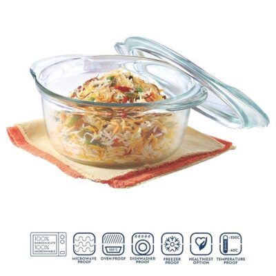 The Borosil Glass Casserole Deep Round Serving Bowl (2.5 L) is a premium multipurpose kitchen essential made from 100 % borosilicate glass, known for its excellent thermal shock resistance and durability compared with ordinary glass — so it can safely handle high temperatures without cracking. With its roomy 2.5-liter capacity, it’s ideal for cooking, baking, reheating, serving, and storing a wide range of dishes, from biryanis and casseroles to salads, batter and dough. The included glass lid helps keep food warm and prevents splashes when heating in the oven or microwave, and the clear body lets you monitor cooking progress at a glance. This bowl is microwave, oven, fridge, freezer, dishwasher, and dishwasher safe, and its non-porous surface won’t absorb stains or odors — making it hygienic, easy to clean, and perfect for everyday use in home kitchens and serving at the table.
