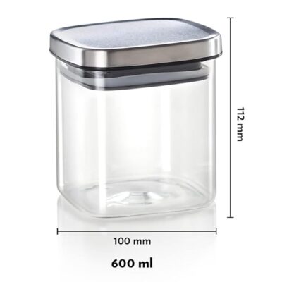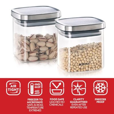 Borosil Classic Square Glass Jar, Air-Tight Storage Container For Kitchen, Glass Jar For Storing Spices, Dals, Grains, Rice, Set of 2 (600 ml each), Clear