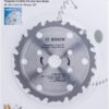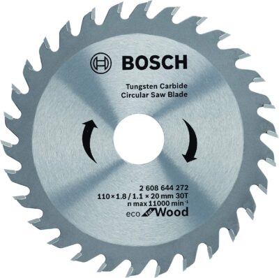 The Bosch coolteQ “Eco for Wood” TCT Circular Saw Blade (Part No. 2608644669) is a 110 mm (4½″) diameter, 20 mm‑arbor blade with 12 precision‑ground tungsten‑carbide teeth, offering a thin‑kerf platform (~1.6 mm body, ~1.0 mm cut width) for fast, accurate cuts in solid wood, plywood, blockboard, laminate, and HDF boards. Built with Bosch’s CoolteQ expansion slots, it actively dissipates heat to reduce blade warping and enhance lifespan, while anti‑kickback shoulders and optimized tooth gullets stabilize feed, improve dust ejection, and reduce feed resistance for safer, smoother operation. It’s rated for up to 11,000 rpm to match most handheld or bench circular saws, and the 20 mm bore fits directly—or can be reduced to 16 mm with sleeves (commonly included in many Bosch kits). Weighing approximately 100 g, this single‑blade consumable delivers professional‑quality performance at a budget‑friendly price—note that Bosch does not extend its standard 1‑year professional warranty to saw blades.