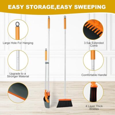 Broom and Dustpan Set with 54-Inch-Long Handle - Perfect Dustpan and Brush Combo for Home Efficient Cleaning (Orange and Grey)