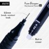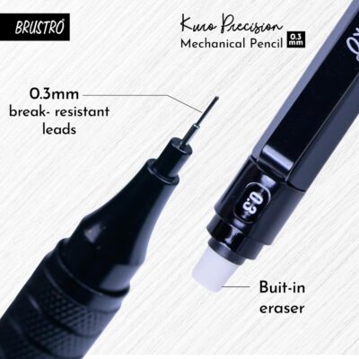 BRUSTRO Kuro Precision Mechanical Pencil features a fine 0.3mm tip with 20 HB leads, 20 2B leads, and 3 eraser refills. Ideal for writing, sketching, drawing, mandala art, and fine art students.