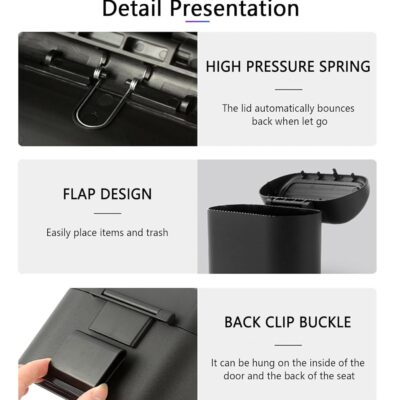 This mini car dustbin in black is a compact, hanging trash container designed for cars, home, or office use. Keeps interiors clean by providing a convenient place to dispose of waste.