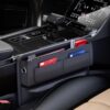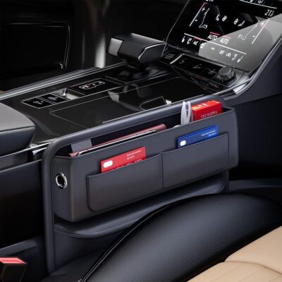This PU leather car seat pocket organizer fits between front seats, providing storage for phones, glasses, keys, and cards. Sleek and practical, it keeps your car interior neat and accessible.
