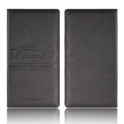 This car registration and insurance card holder is a sleek black faux leather organizer for vehicle documents. Perfect for storing licenses, registration, and insurance papers, it keeps your glove box tidy and accessible.